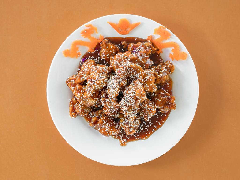 The chicken pieces are HUGE I get the sesame chicken with extra sauce be careful the food can stay hot for years, rice is fluffy and never crunchy, really big portions for five bucks!! That's right, five freakin' bucks!!!